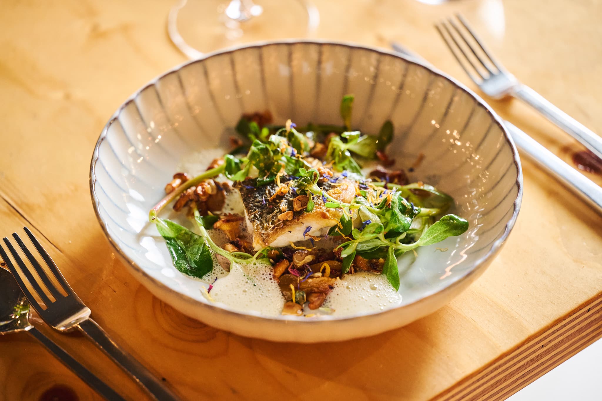 Kartoffelschaum | grüner Spargel | Salat | Bärlauch